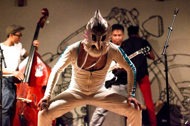 Rockin’ Jelly Bean is an illustrator based out of Tokyo, Japan. His style is as unmistakable as his appearance. The rare times he appears in public, he has a penchant for wearing an outlandish owl-like Mexican wrestling mask complete with feathers, along with a bevy of beautiful women at his side. In the event of a gallery opening of his work, he usually performs 60s surf rock on stage while wearing a jumpsuit (see above photo). His visual style, when it comes to his painting, is largely influenced by a mixture of American pop culture from the 60s and 70s with some Eastern influences from his childhood. Read a great interview with the elusive artist here. Check out some of his work below, along with a great profile courtesy of HypeBeast TV. Above photo courtesy of Deus Ex.