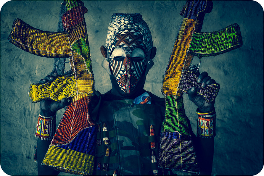 Although Mikhail Kalashnikov, creator of the most widely used assault rifle in the world, passed away just before Christmas, his legacy lives on, and will most likely not end anytime soon. Enter Ralph Ziman, a guy more likely known as a South African filmmaker who brought us movies like Gangster’s Paradise: Jerusalema. He’s also an artist with a new photography exhibition called Ghosts, which points a powerful spotlight on the billion dollar arms trade, and the destructive consequences on African nations. Ziman photographed Zimbabwean street vendors adorned with replica AK-47s featuring traditional Shona beadwork. The results are remarkable. You couldn’t think of a better title for this project. “Ghosts” will appear at C.A.V.E. Gallery in Los Angeles from February 8 until March 2, 2014.